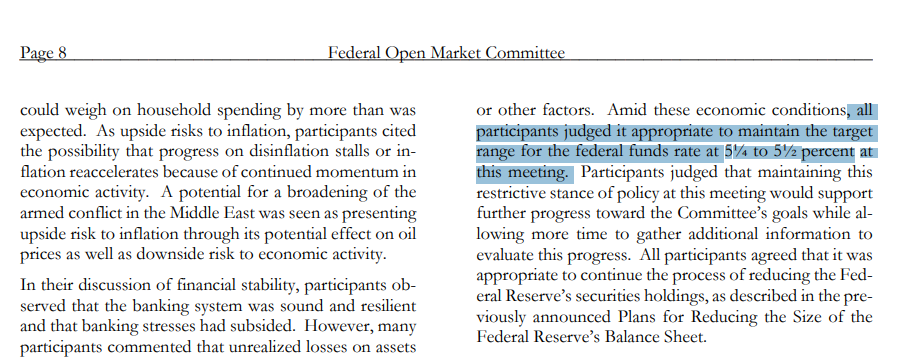 해석 : 모든 참여자들은 5.25% ~ 5.5%(현재 금리)의 타겟 금리를 유지하는 것이 적절하다고 판단