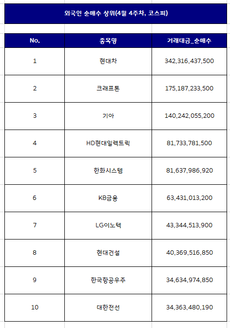 외국인 국내주식 순매수 상위종목 Top10 [4월 4주차]