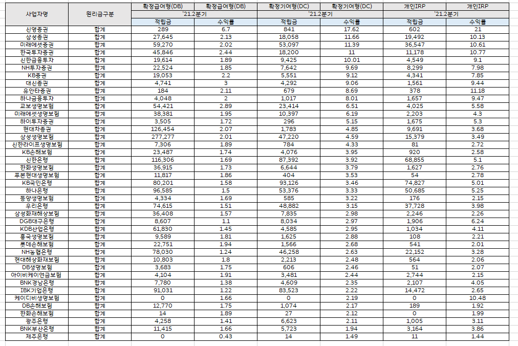 퇴직연금을 다루는 기업들의 수익률에 대해서